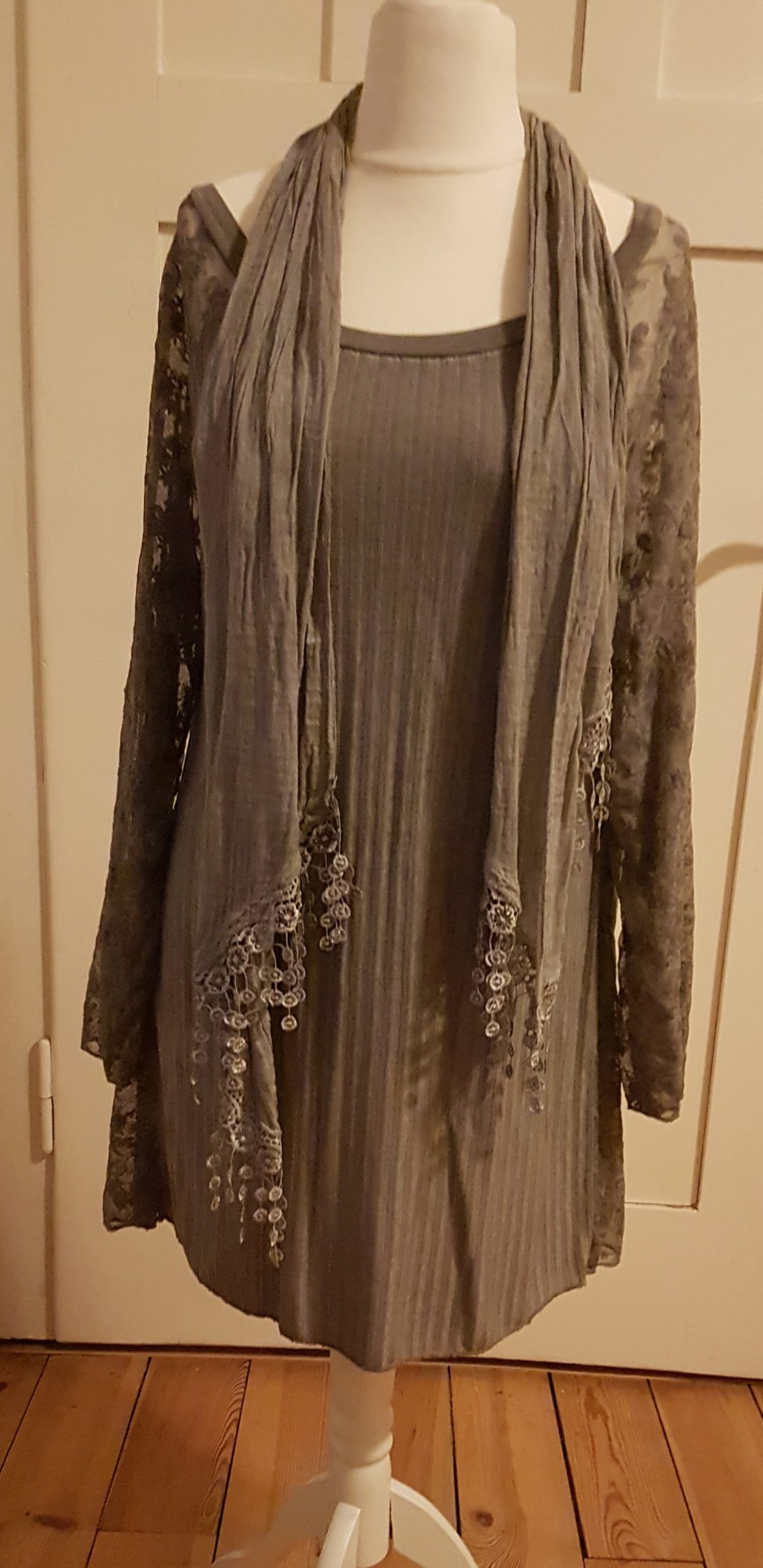 Spitzenärmel können aufgerollt und mit Knopf gehalten werden. Spitzenansatz am unteren Rückenteil.